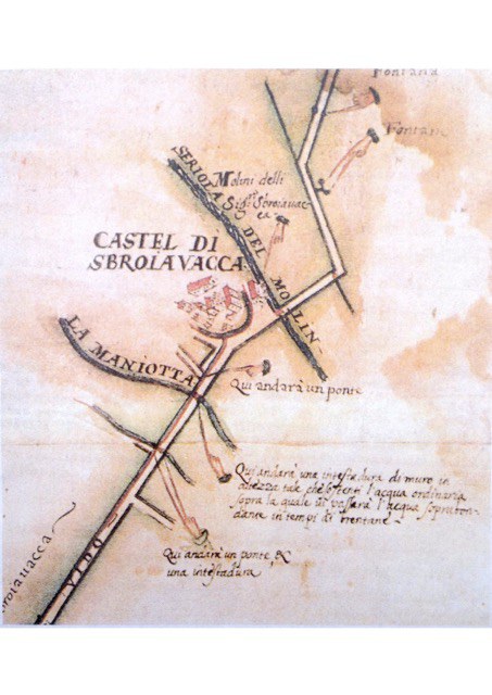 What is left of the Medieval castle at Sbrojavacca is a single tower, while the rest of the building was demolished in 1820 when the castle was converted into a palatial residence by architect Francesco Maria Preti. Since the 12th-13th century the castle and its estate have been a holding of the Counts of Sbrojavacca. In 1251 the fortress was besieged by the troops of Alberigo da Romano; in 1511 it was plundered and pillaged by Leonardo di Prodolone, enemy of the Sbrojavacca family. Surrounded by a wide moat, traces of which can still be recognized, the ancient building has now completely disappeared; in addition, information on the history of the castle is almost non-existent, as the only source describing it has proved unreliable. The only surviving tower has a square plan and six floors including the ground floor; a tooth on its eastern wall indicates that the building once extended in that direction. The chapel standing on the castle grounds was radically remodelled in the 19th century.