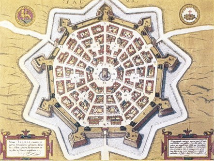 Il 7 di Otubar dal 1593, aromai pierdude la place fuarte impuartante di Gardiscje, te dì dal XXII aniversari de bataie di Lepant, al fo firmât tal cjistiel di Strassolt li dongje l'at di fondazion de fuartece di Palme. A firmâ il document e a inviâ il progjet a forin i senatôrs venezians Marc'Antonio Barbaro, Jacopo Foscarini, Zaccaria Contarini, Marino Grimani e Leonardo Donà, judâts dal anzian Juli Savorgnan. Palme, fuartece a nûf pontis, cenglade di bastions fuartonons e di fossâi larcs, si pues tignîle tant che un fortunât esercizi tal meti in vore chel che al jere stât esprimût dai tratâts rinassimentâi in mert aes tematichis de citât ideâl, e par chest pont strategjic pe difese dal teritori de Serenissime cuintri la agression imperiâl e turche a soreli jevât. Dividude in nûf baluarts (Grimani, Savorgnan, Foscarini, Villachiara, Contarini, Garzoni, Mont, Donato e Barbaro), la citât, tornade a batiâ di Napoleon "Palme la Gnove", e je un poligon di 18 lâts che si rivii passant par trê puartis (Aquilee, Udin e Cividât) progjetadis di Antonio Scamozzi tra il 1598 e il 1605.
