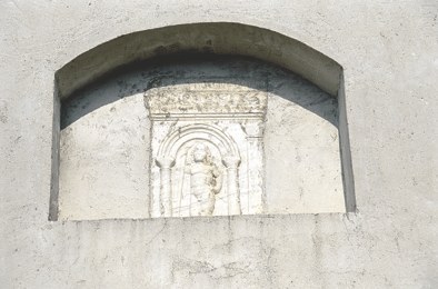 Sulla parete esterna rivolta a levante della chiesa, sotto gli archetti polilobi in cotto, sotto la gronda, è murato un fregio su pietra di evidente derivazione longobarda.