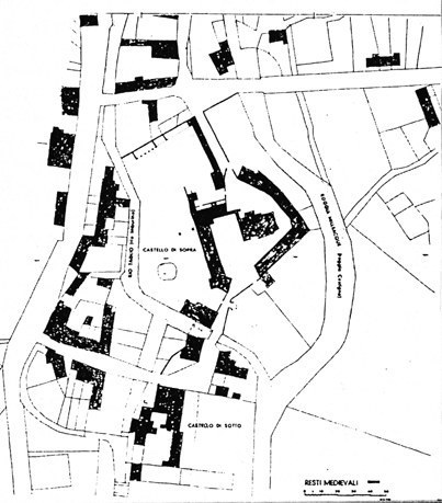 Attorno all'antichissimo torrione, scapezzato nell'Ottocento ma ancora alto 12 metri, si sviluppa il castello di sopra, al quale si accede attraverso l'antica porta Cistigna, con il palazzo signorile affacciato su un elegante giardino racchiuso da corsi d'acqua, varî fabbricati un tempo con funzione agricola ed amministrativa e al centro la chiesa di San Nicolò, antica cappella castellana ampliata nel Settecento, di bel disegno, con interessanti esempî dell'arte locale. L'interno del palazzo (che fu abitato anche dal maresciallo Radetzky, marito d'una contessa Strassoldo) presenta ambienti ricchi di memorie familiari.