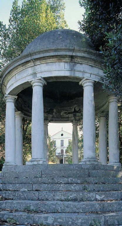 Arricchì il verde di fontane, serre e monumenti tra cui un tempietto eretto nel 1812 in memoria della moglie, la contessa Valburga, tuttora visibile al termine del viale che dalla dimora signorile si allontana in direzione di Castelvecchio.