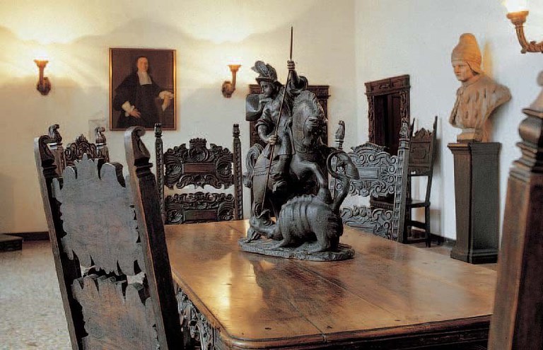 Per creare nel castello una sala di rappresentanza, furono acquistati i mobili con cui Giuseppe Caprin (1843-1904) arredò la sua «Sala Veneta», luogo di ritrovo degli intellettuali della seconda metà del XIX secolo. Al primo piano dell’edificio si possono così apprezzare, oltre all’imponente arredo, dipinti dei secoli XVI-XVIII e, sul soffitto, una grande tela di Andrea Celesti (1637-1712) raffigurante il Trionfo di Venezia. Da segnalare infine la presenza al piano terra di una piccola cappella con esempi di scultura lignea (probabilmente del XVI secolo) e dipinti a decorare l’ambiente, nonché del tradizionale simbolo della città, il Melone, in origine elemento decorativo scolpito a tutto tondo e posto sulla cuspide del campanile della cattedrale (1343).