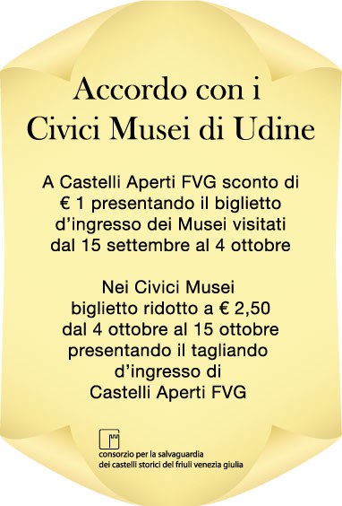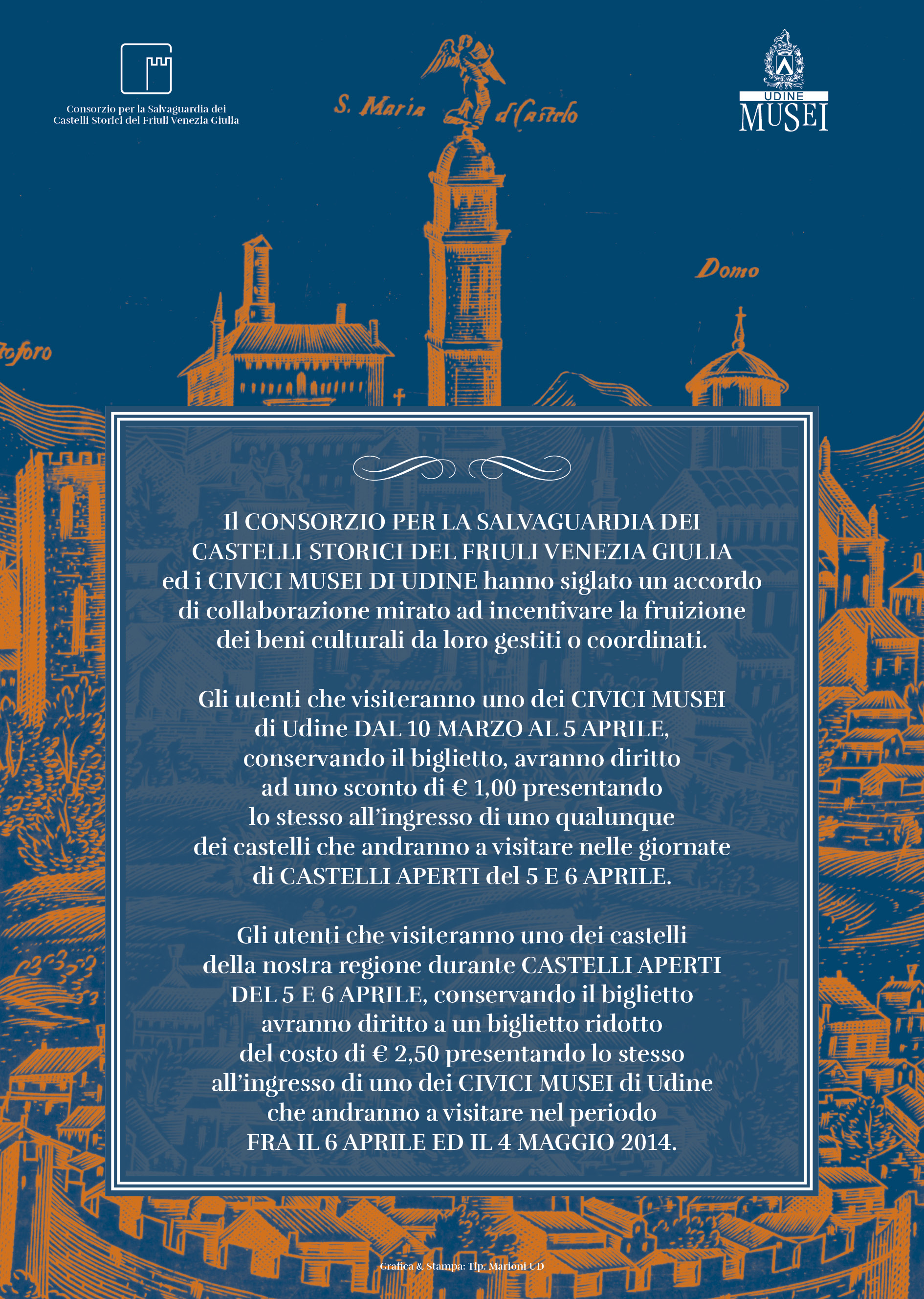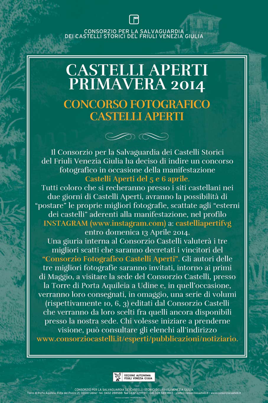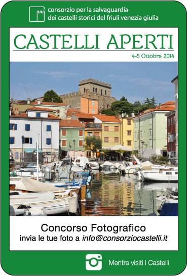 Anno 2014 Castelli Aperti 5 e 6 aprile Accordo Consorzio Castelli-Civici Musei di Udine Concorso Fotografico 1° classificato - signor Giorgio Turcutti 2° classificato - signora Paola Lorenzon 3° classificato - signor Alessandro Zanini Castelli Aperti 4 e 5 ottobre Accordo Consorzio Castelli-Civici Musei di Udine Concorso Fotografico 1° classificato - signora Roberta Grubelli 2° classificato - signora Franca Filaferro 3° classificato - signor Bruno Caldana