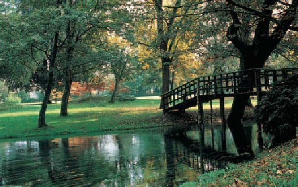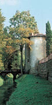 The castle is surrounded by a lush, green carpet of grass bounded by a moat filled with water by the Cusana canal. Three bridges cross the moat: the west bridge connects the castle to the street, the east bridge arises from a terraced strip of land, the third bridge connects the English-style lawn and the park. The park extends out to an ancient wood predominately composed of hornbeams (typical of this wetland area) and oak trees; to create the park this wood was slightly thinned out and plane and cypress trees were added. Even though the park has been recently created it can proudly boast the presence of a tree well over three hundred years old: a magnificent oak tree. The oak tree was considered sacred both to the Romans and the Germans. Another wonderful tree can be found in the park, the bald cypress (Taxodium Distichum), a tree originally from the American swamps and planted here to check the embankments; it is easy to recognise by its roots which protrude from the surface of the water permitting the roots underneath to breathe.